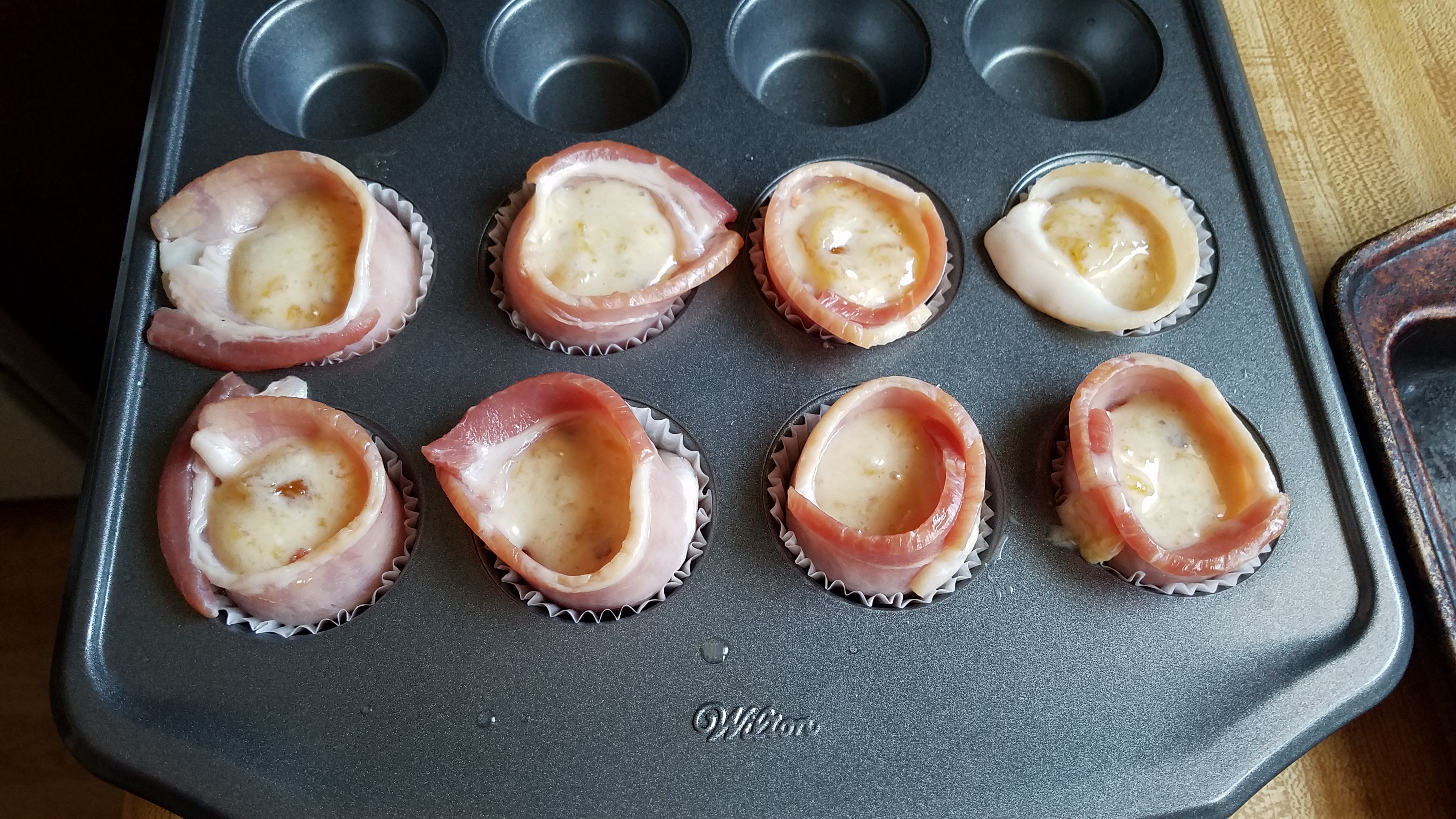 5) Take half a piece of bacon and wrap it around the outside of the mini muffin tin, forming a cup.